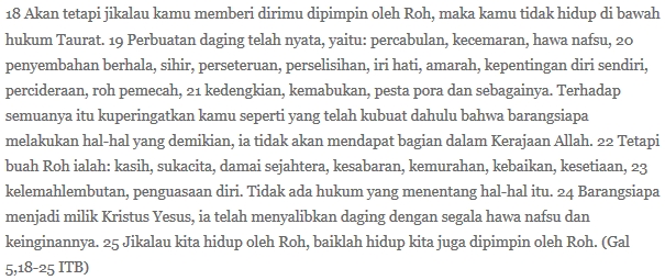 Andaikanlah Anda hendak mendidik anak untuk hidup secara ekologis dengan cara membawa bekal makanan dari rumah sehingga tak jajan di warung dan dengan demikian mengurangi potensi sampah plastik. Saya berpesan, jangan lupa didiklah anak Anda untuk membersihkan wadah bekal makanannya juga. Kenapa? Tak ada gunanya ia berkoar-koar bergaya hidup ekologis tetapi mencuci wadah makanan saja dibebankannya pada orang lain. Ha njuk yang bergaya ekologis tuh siapa jal? Celakalah kamu juga, pemuka agama, sebab kamu meletakkan beban yang tak tertanggungkan kepada orang lain, tetapi kamu sendiri tidak menyentuh beban itu dengan satu jari pun!