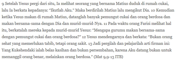 Betullah Guru dari Nazareth itu memanggil Lewi, sosok yang rupanya butuh bantuan untuk mengenali dirinya sendiri dan pada gilirannya mengenal Allah. Ini bukan sosok yang hanya ada di ranah perpajakan, melainkan juga di segala ranah yang sudah sedemikian teracuni paham agama yang sangat sektarian, yang betul-betul membahayakan NKRI karena tak kenal peribahasa di mana bumi dipijak, di situ langit dijunjung.