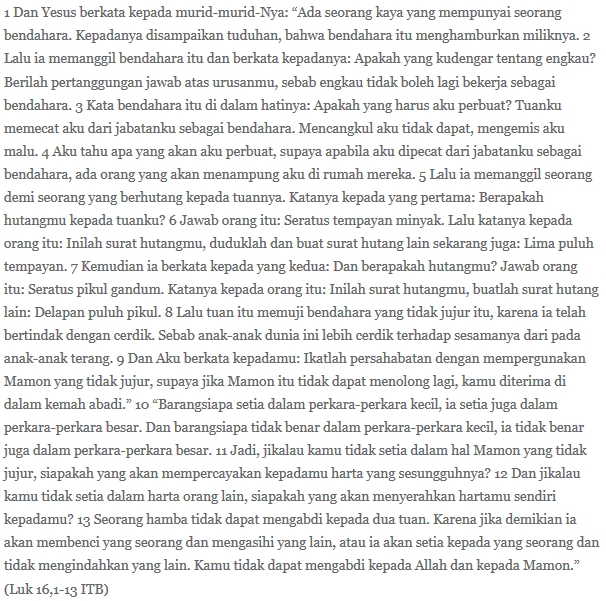 Teks bacaan hari ini memang tidak bicara mengenai pemilihan jodoh, tapi pemilihan teman atau sahabat. Bendahara yang tak jujur itu mengambil keuntungan dari mark up atau selisih antara hutang para reseller perusahaan tuannya. Dia berteman dengan ‘mamon’ yang diperolehnya dengan jalan pintas sampai akhirnya ketahuan oleh tuannya sehingga jelaslah dia akan dipecat. Menariknya, tuan itu memuji kecerdikan bendahara yang tak jujur itu. Lah, gak jujur kok malah dipuji?