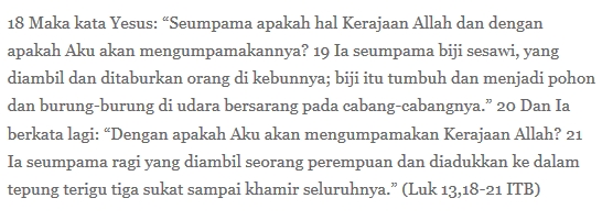 Tanggapan mbak-mbak yang tersenyum lebar itu menunjukkan kepada saya Kerajaan Allah yang diumpamakan Guru dari Nazareth sebagai biji sesawi. Ia mengingatkan saya pada saran Mother Teresa: Not all of us can do great things. But we can do small things with great love. Itulah Kerajaan Allah. Tak usah bertele-tele, dan dengan bertele-tele pun toh persoalannya tidak semakin jadi gampang.