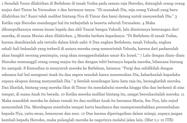 Penulis Matius rupanya akrab dengan teks jadul (Bil 22-24, ceritanya sangat menarik) mengenai ahli “tenung”, magi, semacam dukun, yang diminta raja Balak untuk mengutuk bangsa Israel saat itu, tetapi orang “majus” (begitulah diterjemahkan julukan magi, para “sarjana” Persia) itu malah memberkati Israel. Apa daya, alih-alih mengecam Israel, Bileam malah mengucap berkat bagi Israel. Bileam memakai kalimat “bintang terbit dari Yakub”, yang oleh bangsa Israel waktu itu diasosiasikan dengan dinasti Daud.