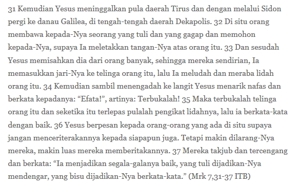 Setelah perjumpaannya dengan perempuan Yunani itu, sudah saya bilang, Guru dari Nazareth bertobat, tetapi tobat ini tobat orang dewasa, bukan tobat ala anak-anak yang terhubung dengan dosa ini itu, melainkan tobat dewasa yang memperluas perspektif hidupnya. Ia menyadari bahwa ia tidak tercipta hanya untuk keluarga Daud, tetapi untuk siapa saja yang mau datang kepadanya. Nah, caranya menyembuhkan orang tuli itu juga ternyata memakai eksklusi juga. Ia memisahkan orang tuli itu dari kerumunan orang banyak dulu. Eksklusi dipakai bukan saja supaya orang sakit tak terkontaminasi, melainkan lebih-lebih supaya orang lebih terhubung secara pribadi dengan belas kasih Allah.