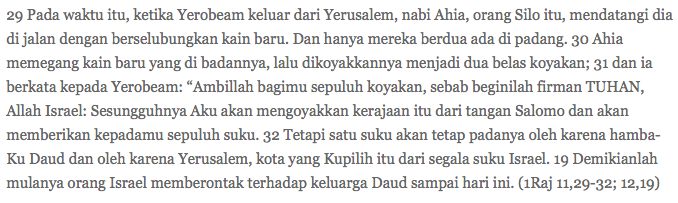 Mari lihat kasusnya. Dalam teks bacaan pertama dinarasikan bagaimana akibat perselingkuhan Salomo suku-suku Israel diceraiberaikan. Tandanya disampaikan Nabi Ahia kepada Yerobeam. Ia menyobek-nyobek kain barunya jadi dua belas bagian, dan sepuluh sobekan diberikannya kepada Yerobeam sebagai tanda bahwa Yerobeam akan menguasai sepuluh suku Israel. Njuk yang dua gimana? Silakan tanya ke dosen Kitab Suci ya.
