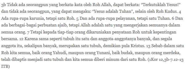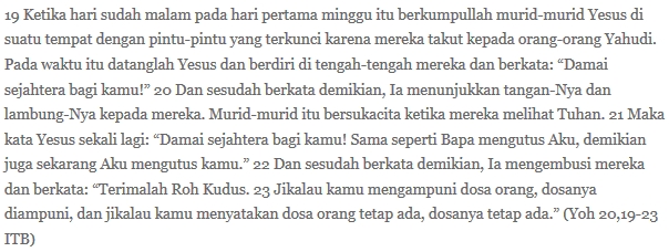 Begitu pula dengan Pentakosta; tak perlu menunggu tujuh minggu setelah Paska sebagaimana dirayakan orang Yahudi! Pemberian roh itu sudah terjadi sejak hidup dan kebangkitannya, sebagaimana dituliskan dalam teks bacaan ketiga hari ini.