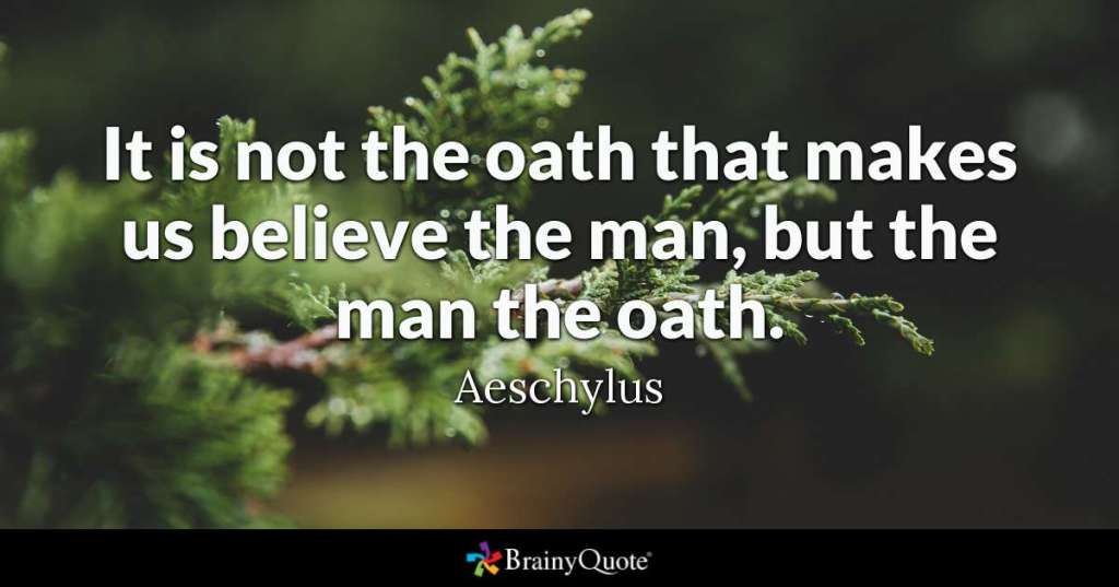 Kalau bersumpah demi Allah, mosok sampah sih, Rom? Justru itu problemnya: bukan perkara demi Allah atau demi yang lainnya, melainkan perkara integritas pribadi orangnya. Kata Aeschylus: it is not the oath that makes us believe the man, but the man the oath. Artinya, integritas pribadilah yang menentukan sumpah itu layak dipercaya, bukan sebaliknya. Kalau orang sudah jujur dengan kata-katanya, ia tak butuh legitimasi Allah, tak butuh pula memaksa orang lain untuk percaya karena kejujurannya itu sendiri adalah buah relasi intimnya dengan Allah.