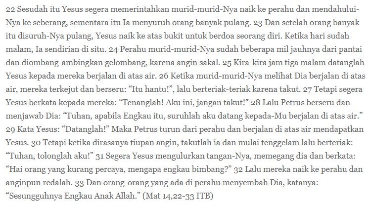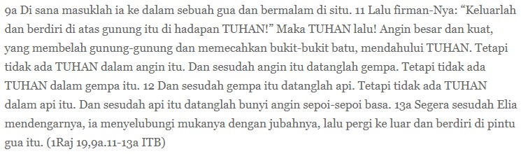 Ini berkebalikan dengan teks bacaan pertama: Allah hadir dalam angin sepoi-sepoi, dalam ketenangan. Akan tetapi, kutipan hari ini menghilangkan pertanyaan dari Allah,”Ngapain kamu di situ?” Kalau begitu, Allah memang hadir dengan modalitas apa pun: saat tenang dan badai, saat sehat dan sakit, dalam untung dan malang, dalam usia pendek dan panjang, saat kaya dan miskin, dan seterusnya. Kalau begitu, yang diminta dari komunitas beriman bukanlah bahwa ia mesti sehat sepanjang segala abad atau miskin selamanya, melainkan bahwa dalam segala hal mereka perlu menatap kehadiran Allah dalam hidup mereka.