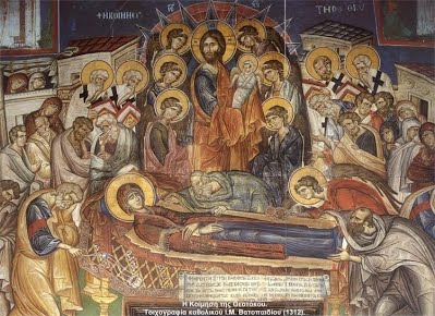 Sekurang-kurangnya dalam keyakinan pribadi saya, beliau ya mengenal kematian juga, tetapi kapan dan di mana, ya emboh. Itu tak penting lagi. Yang lebih penting adalah memaknai keyakinan bahwa beliau diangkat ke surga. Untuk itu, saya sodorkan ikonografi yang sangat familiar di Gereja Ortodoks.