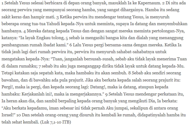 Akan tetapi, perwira itu malah menunjukkan ketidakpantasan dirinya menerima Guru dari Nazareth sekaligus menunjukkan kepercayaannya terhadap otoritas Guru dari Nazareth untuk menyembuhkan orang. Tak mengherankan bahwa Guru dari Nazareth pun heran, kok ada orang yang punya iman kayak gitu dan dari luar lingkungan agama Yahudi pula!