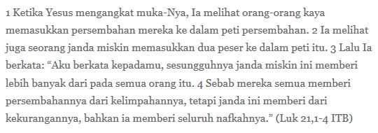 Just some thoughts, Rm. Mns seringkali salah paham ttg mengapa Tuhan memberkati kita. Pdhl sbnrnya agr kt menjd berkat bg org lain. Itu bs jd salah satu metode Tuhan, seperti pay it forward, shg belas kasih Tuhan terus menjalar, dn menjangkau semua. Seperti Tuhan Yesus yg sdh mengurbankan DiriNya utk keselamatan mns. Supaya dg teladan cinta kasihNya, mns pun pay it forward, saling membantu dn mengasihi. Tp susahnya org2 seringkali malah saling menyerang dn mencuri bahkan membunuh utk mendptkn lbh banyak berkat Tuhan utk diri mereka sendiri. Shg kisah Sang Janda yg memberi dr kekurangannya, bahkan seluruh nafkahnya mempunyai 2 sisi wajah. Sisi umum, yg lebih populer, ttg hati yg taat, sebuah totalitas, pengurbanan. Sisi lain, yg lebih muram dn tdk populer, suatu ilustrasi ketdkadilan, krn berlawanan dg belas kasih Tuhan yg sbnrnya gratis, seperti hujan dn sinar matahari, seperti udara dn alam semesta. Memberikan segalanya ke titik menyakiti diri sendiri bs jd lalu lahir dr budaya manipulatif yg diciptakan. Apakah kt bs mengatakan bhw penghidupan/kehidupan sang janda lbh penting atau tdk lbh penting drpd pujian atas totalitas pengurbanannya (memberikan uang yg dia butuhkn utk bertahan hidup), brgkl menarik utk dipikirkn.