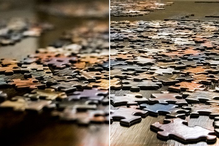 Untuk membantu menjawab pertanyaan itu, mari lihat dua istilah teknis dalam filsafat: objek formal dan objek material. Bisa diketahui dari kolase foto kedua bahwa objek yang sebetulnya jadi sasaran itu ya sama: seluruh keping puzzle di meja (atau lantai). Seluruh keping puzzle di meja itulah yang disebut sebagai objek material, objek yang jadi fokus atau sasaran kajian atau pembahasan.