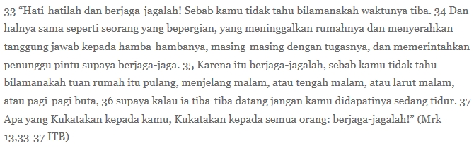 Berjaga-jaga barangkali lebih klop dengan drama pertama tadi: apa pun kondisinya, setiap orang beriman hidup dalam cinta. Juga dalam kondisi tersulit, orang beriman mencari peluang supaya harapan lebih kuat daripada putus asa, kepercayaan lebih setrong daripada ketakutan, komitmen lebih teguh daripada sentimen, ego tunduk pada nilai luhur, dan cinta lebih hidup daripada kebencian.