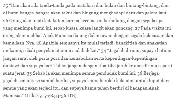 Setelah saya bergabung dengan sebuah geng internasional, saya mendapati jawaban itu begitu ideologis. Ideologi kekristenan tentu saja. Artinya, ya demi kepentingan agama, bisalah dipakai jawaban-jawaban seperti itu. Bukankah itu cocok dengan keyakinan Katolik tentang Allah yang menjelma dan kelak akan datang lagi jelmaan ini dalam penghakiman terakhir? Sampai di situ, tanpa repot-repot untuk membela kebenaran ideologis itu, saya mendapati bahwa masa Adven itu rasanya seperti tim sepak bola nasional Indonesia menjelang pertandingan kualifikasi Piala Dunia 2026 pada bulan Maret mendatang.