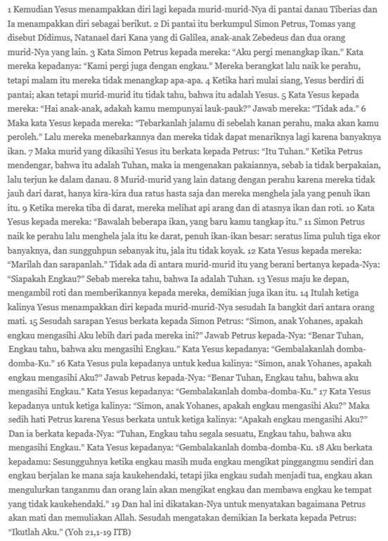 Teks bacaan utama hari ini menuturkan bahwa Petrus, begitu dikasih tahu bahwa orang nun jauh di sana itu Yesus, segera mengenakan pakaian, karena katanya ia tak berpakaian. Aneh juga, mosok orang cari ikan malam-malam nan dingin begitu gak pakai apa-apa. Jadi, pastilah penulis Yohanes ini tidak sedang bikin laporan mengenai penampakan Yesus, melainkan menggambarkan bagaimana kebangkitan itu berdampak. Salah satunya ialah bahwa si Petrus njuk mengenakan pakaian, dan pakaian ini bukan lagi pakaian jubah dan mantol. Aneh aja dong mau nyemplung ke air malah pakai mantol dan jubah. Jadi, kalau mau logis-logisan sebagai laporan peristiwa, tentu bukan mantol dan jubah, melainkan perizoma yang bisa dikencangkan di pinggang.