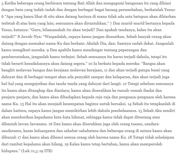 Wanti-wanti yang diletakkan pada mulut Yesus dalam teks bacaan hari ini merujuk pada Bait Allah yang tidak bisa disejajarkan dengan tempat ibadah yang megah, tetapi dengan gaya hidup yang menggugah kesadaran orang akan karakter yang takkan terombang-ambing oleh pesona wang sinawang. Karakter seperti ini bisa jadi terbangun dari kebiasaan-kebiasaan kecil yang memuat kesadaran hidup sewajarnya seperti tersirat dalam teks bacaan kedua: ini bukan perkara transaksional bahwa orang bekerja mendapat upah dan yang tak bekerja tak layak dapat makan, melainkan perkara hidup yang dipertanggungjawabkan dengan kejujuran dan kerja keras di tengah abainya pemangku pranata sosial.