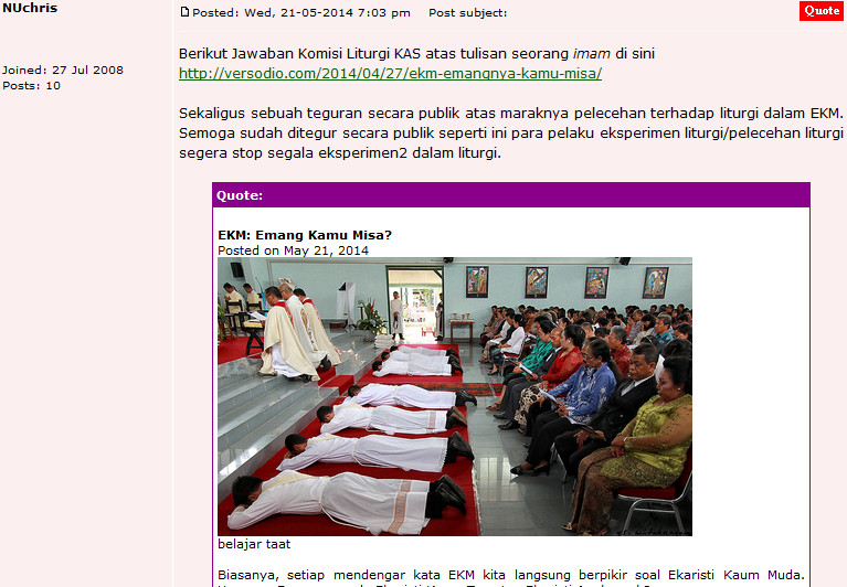 Menurut salah satu komentar dalam thread “Komlit KAS: Masih Katolik Romakah Anda?” pada forum website ekaristi.org, tulisan berjudul “EKM: Emangnya Kamu Misa?” mendapat jawaban dari Komisi Liturgi KAS. EKMSetelah saya coba baca baik-baik, kok tampaknya saya tidak mengajukan pertanyaan kepada Komlit KAS dan Komlit KAS juga, dengan demikian, tidak menyodorkan jawaban. Yang saya tahu hanya bahwa dengan nama Komlit KAS telah dipublikasikan posting yang memakai judul posting saya. Memang akhiran ‘nya’ pada kata emang dihilangkan, tetapi prinsipnya sama. Tak apa, dalam hal ini saya gak rempong dengan hak intelektual (tulisan berjudul Revolusi Mental pun bisa dibuat oleh Jokowi dan Romo Benny Susetyo bahkan dalam waktu relatif bersamaan).